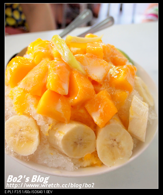 雖說是牛乳冰,但煉乳味似乎稍稀了些,整體還是著重在芒果上。除了芒果跟香蕉,上頭還加了些許的芒果青切片,還附了檸檬片,
