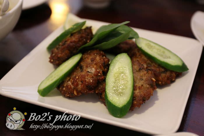 炸肉餅+小黃瓜+九層塔一起入口,九層塔馨香的氣味可以降低肉餅的油膩感,