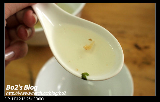 清澈透明的湯頭..裡頭加上油蔥和芹菜末…喝起來有淡淡回甘的鮮甜味..