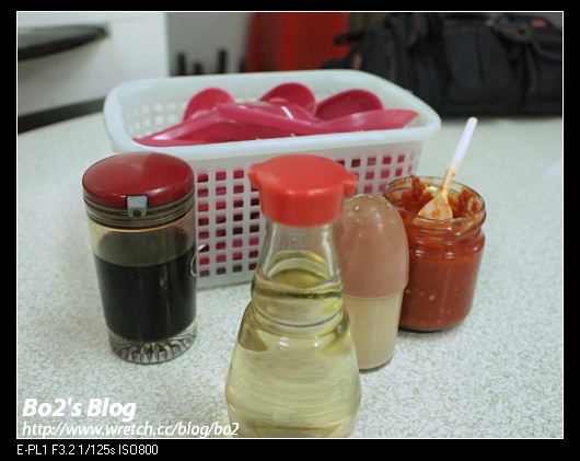 桌上有醬油和辣椒醬等調味料..