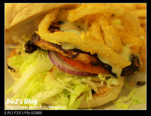 生菜+蕃茄片+洋蔥+炭烤雞肉+炸洋蔥+起司….
