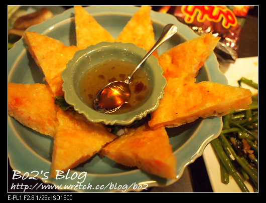 呈放射狀的擺盤..搭上這綠色盤子..就是很好看..月亮蝦餅一份八片…還頗有厚度…