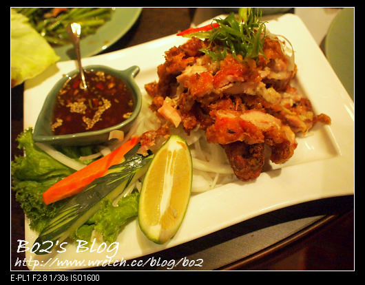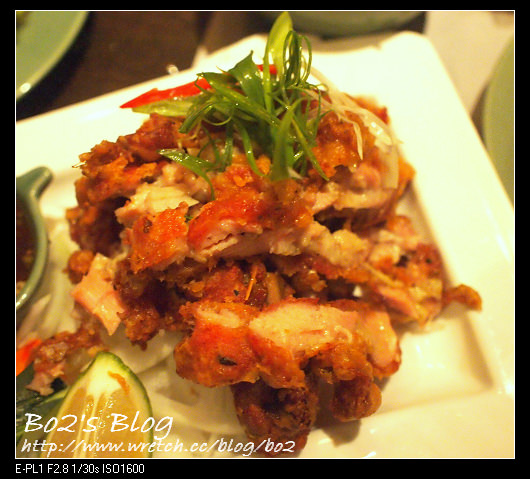 洋蔥絲當底..放上炸過的雞肉..旁邊附上酸甜又帶點辣味的沾醬..外皮酥脆.卻不夠味..好吃.但總覺得少了一味…