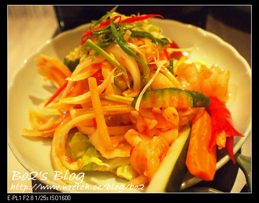 過水燙蝦子.花枝.蟹腳等.加上切絲洋蔥.芹菜.高麗菜及小黃瓜塊…外觀看起來紅通通..對嗜辣的我來說..這樣的辣味並不算太辣…