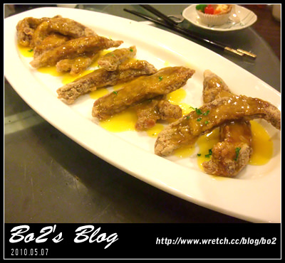 將鮪魚肋排肉裹粉炸過..搭配酸酸甜甜的橙汁..