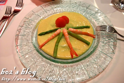 店內裝潢主要以紅色和黑色為主…紅黑兩色營造出鮮明的對比..——————西堤的套餐為單一定價..開胃菜+沙瓦+主餐+甜點+飲料..價格皆為$499+10%雖然價位並不算太便宜..但就菜色.口味.服務(服務這點的確是挺用心的)來看…蠻物超所值..也無怪乎要先訂位比較保險..是會讓我再度回訪的好地方呢..——————【開胃菜】鮮蝦蘆筍