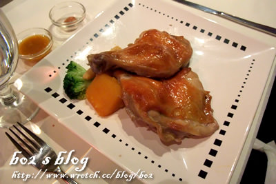 表皮看起來金黃酥脆的烤雞..肉質鮮嫩..嚐的到淡淡的迷迭香香味..這調味也是稍淡..適合不愛吃重口味的人..——————【主餐】法式鴨胸