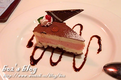 淡淡的起士口味與巧克力蛋糕…中間夾著草莓口味的慕斯..上面灑上巧克力粉..口感豐富有層次..不會太甜..口味很清爽呢.