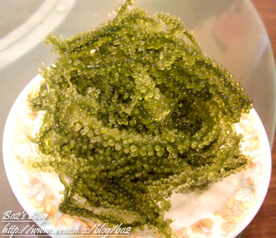 當天”喬治大”還帶了海葡萄來和大家分享…聽說目前東港已開始在培育…這”海葡萄”一顆一顆串在一起..如葡萄般的外觀很獨特..口感和鹹味.頗像鮭魚卵..豐富的營養素..是很優的保健食品哩