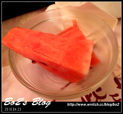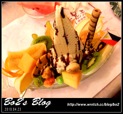 所以就心血來潮的點了這個”炫風水果船”…由各式水果.餅乾及冰淇淋組成..淋上些許的巧克力醬..看起來的確是很華麗呢…