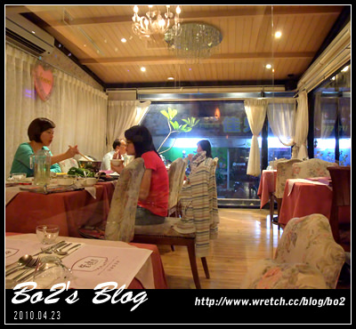 餐廳佈置主要以粉色系為基底..淡色系的玫瑰壁紙及桌巾..窗簾紗布.充滿夢幻氣息..空氣中散佈淡淡的精油香氣…印像中..晚上不知道過了幾點…主燈就會關掉..店家會在桌上點上浮水小蠟燭..營造出浪漫情調..