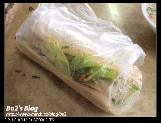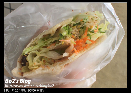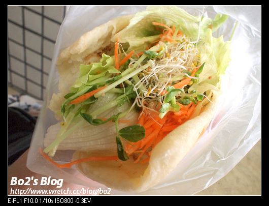 這是第二次來吃的時候點的….燒餅皮內包了滿滿的生菜..有高麗菜.苜蓿芽.豆芽菜.紅蘿蔔絲.葡萄乾等等..份量很足..