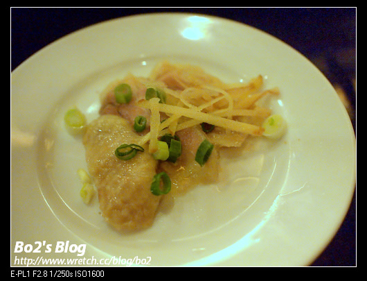 三片薄薄的醉雞上撒了些薑絲….冰涼彈Q的醉雞肉..口感偏硬但卻不至於過於乾柴..