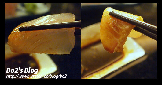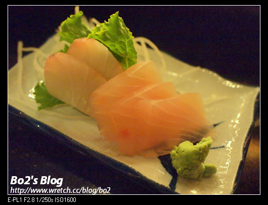 對魚生並沒有很深度的了解..沒猜錯的話這應該是旗魚肉跟海鱺…口感很脆彈..吃得出魚肉的新鮮度…可惜不夠冰鎮..我偏好吃起來爽脆卻又冰涼的生魚片…