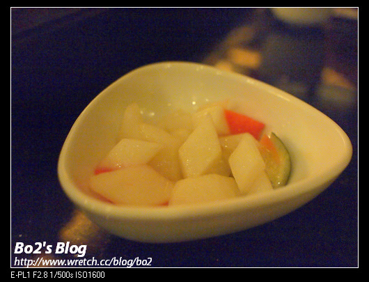 入座熱茶就會砌上..帶點微甜….對只喝無糖飲料的我來說這麥茶只是沾一下嘴用的—————–【醃漬蘿蔔】-招待小菜