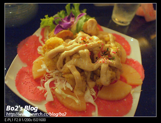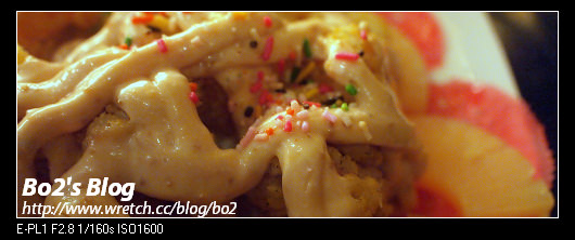 鳳梨感覺是”鳳梨罐頭”內的鳳梨味….和”日式沙拉”一樣..沾醬用的是帶有花生味的千島沙拉醬…