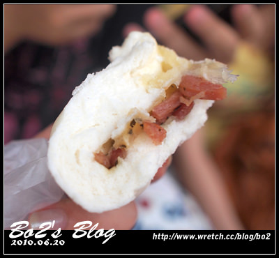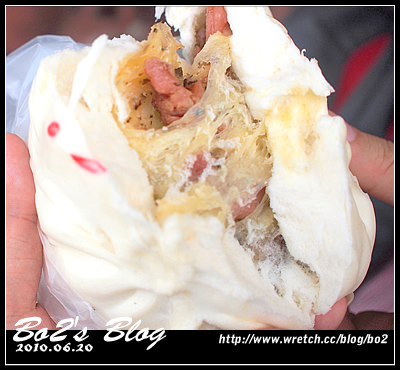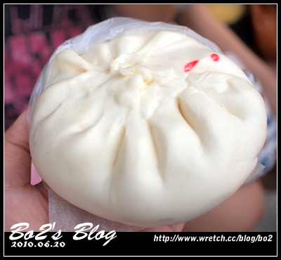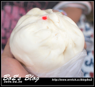 圓圓的包子上用兩顆紅點點作為辨識..我當下買了立刻現吃..沒有想像中那種熱呼呼燙手的感覺..雖然兩家都是用鐵製蒸籠…不知道是不是生意好壞有差…