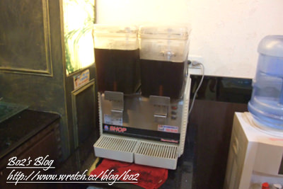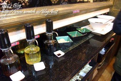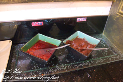 位於醬料區旁..有提供免費的紅茶及白開水..紅茶還算不錯喝.不過因為我少喝有糖飲料..覺得稍稍過甜了些….——————【沾醬-十八醬(左).沙茶醬(右)】