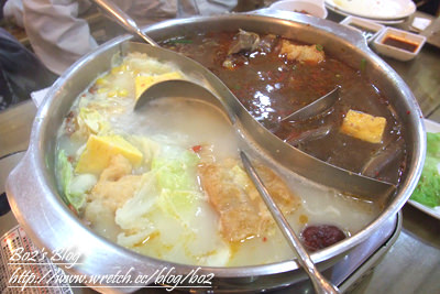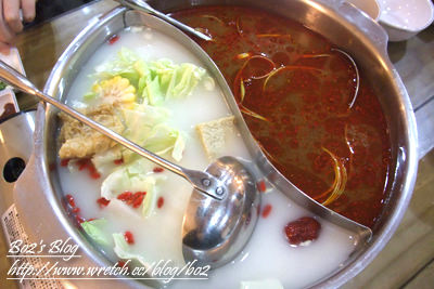 想說要多嘗試不同的口味..所以點了鴛鴦鍋鴛鴦鍋可以選兩種口味的湯底..當天是選了基本款的(養生龍骨/麻辣燙)兩種…白色的龍骨湯底..喝起來果真有淡淡大骨湯頭滋味..雖然不錯喝..不過就是常見的龍骨鍋底..沒什麼特色..