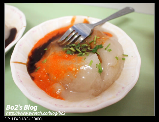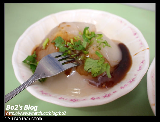 肉圓淋上白色又透了些醬油膏的醬汁….上面還灑了些香菜…看起來挺誘人..有加辣的話…又會多了鮮明的深橘色辣椒醬….