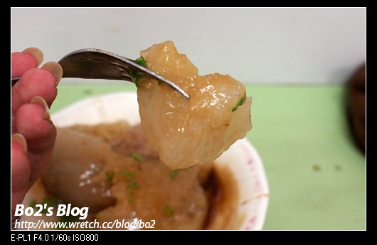 雖也帶點QQ的彈性…不過較”焱金光肉圓”口感來的偏軟些..肉圓的豬肉內餡是糰狀..吃起來有點像”魚丸漿”凝結成的硬塊…