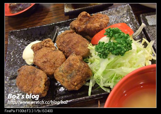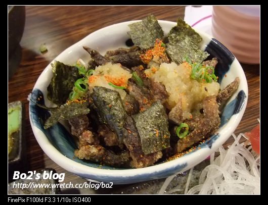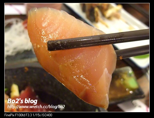 一樣部位的肉..卻因不同的處理方式..給人的感覺也大不相同..裹上粉油炸的尾膠肉…肉質蠻軟嫩…沾上旁邊白色的美乃滋入口..味道更是一絕…——————【血合肉】- NT.50