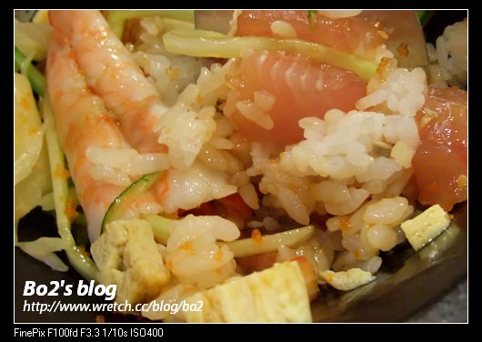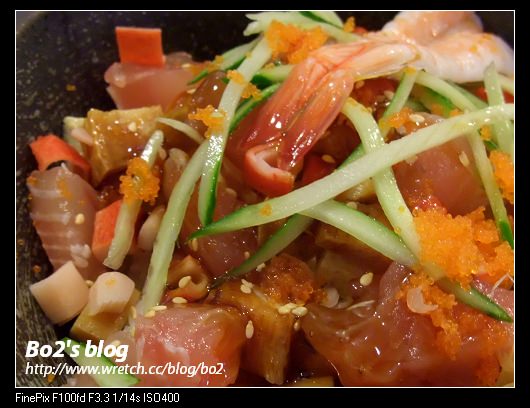新鮮的鮪魚.旗魚肉切成小塊狀.加上切丁的煎蛋及蟹肉.再加上魚卵..上頭淋上自家醬料..醬汁分佈稍嫌不均..有點小鹹…