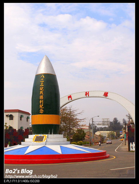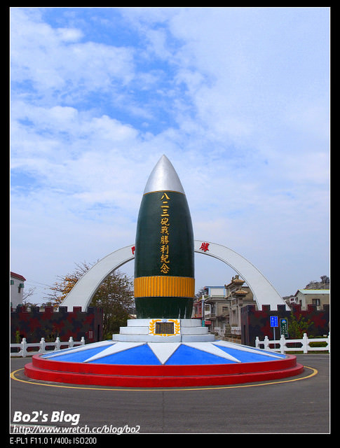 離開九宮碼頭後,第一個會經過的景點是”八二三砲戰勝利紀念碑”要說”八二三砲戰勝利紀念碑”在金門可不只有這邊有,但是要找這砲彈造型的,就只有小金的這尊了。底下的基座是青天白日圖樣,造型很特殊哩,配上後頭的勝利門,謂為小金門的著名地標之一,以前常看書上介紹,能夠親眼目睹那種感覺更是不一樣。