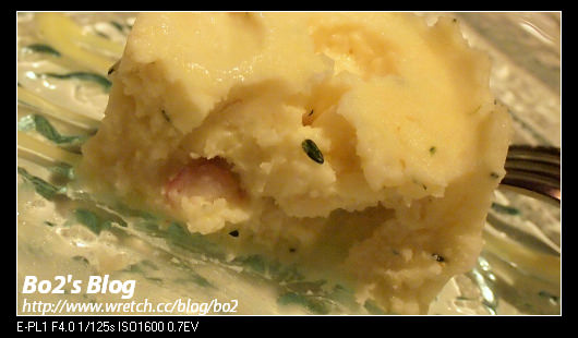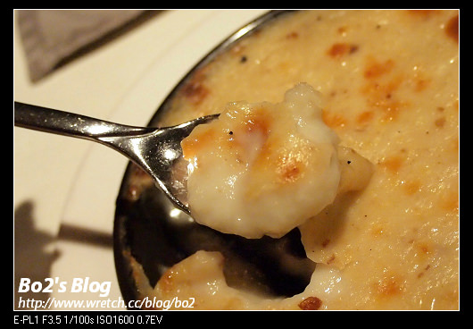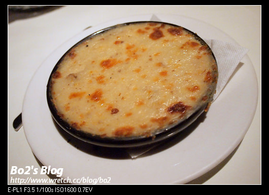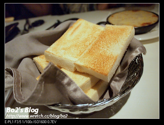前菜有”焗烤蘑菇+方塊麵包”及”牛肉焗丹麥餅”兩種選擇..看到牛肉兩字就只能自動放棄(泣)…表皮帶點微焦的方塊麵包..外酥內軟..沾上焗烤蘑菇食用…