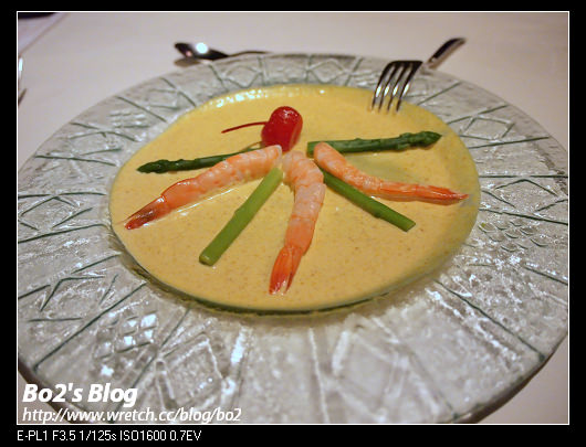 特製的黃色沾醬..原來是咖哩優格醬…沒有很厚重的咖哩味…這醬就算拿來搭麵包吃也很合搭上頭擺了川燙過的新鮮蝦子跟蘆筍..口味清爽具開胃效果…特殊的是..蝦子跟蘆筍..可以全數換成蝦子或蘆筍…對蝦子過敏或是不愛吃蘆筍的人來說..這樣的服務還真是貼心..