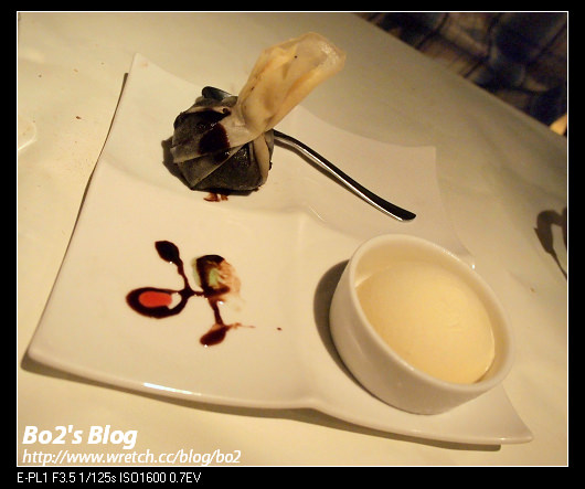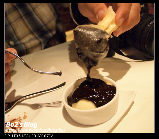 熱熱的巧克力醬..外頭用春捲皮包覆….食用前將春捲皮戳破讓巧克力醬淋在冰淇淋上…