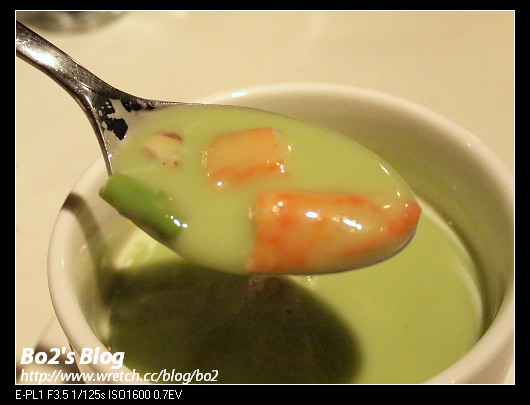 看那綠色的模樣..果真是”蘆筍”濃湯來著…喝的出蔬菜氣味..但無法判斷是否為”蘆筍”滋味…這湯品奶香味偏重..裡頭還有蟹棒等配料..還算濃順好喝