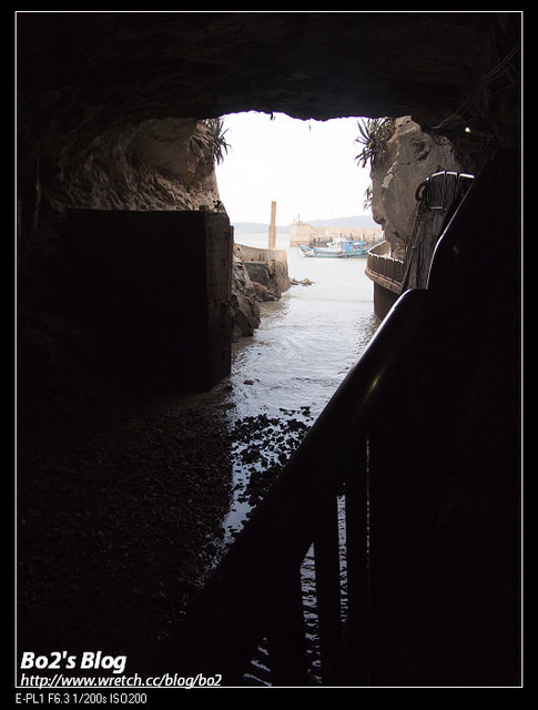 有別於翟山坑道底部與出海口相連部份是封住狀態,九宮坑道則是採開放式的,走到底放眼望去,看到的是”羅厝港”港口,有種豁然開朗之感。這算是九宮坑道的南處出口。