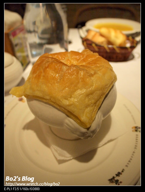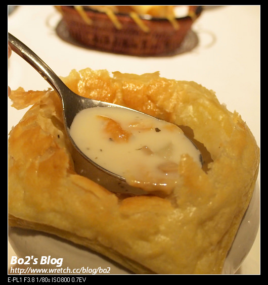 裡頭的蘑菇濃湯,除了蘑菇外,還有不少的洋蔥。口感濃順,十分好喝哩,加上外頭烤的很香酥的派皮一起也挺不錯。