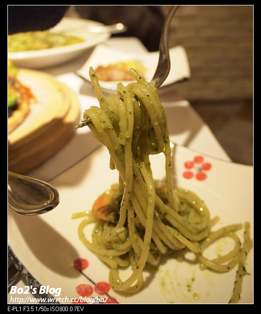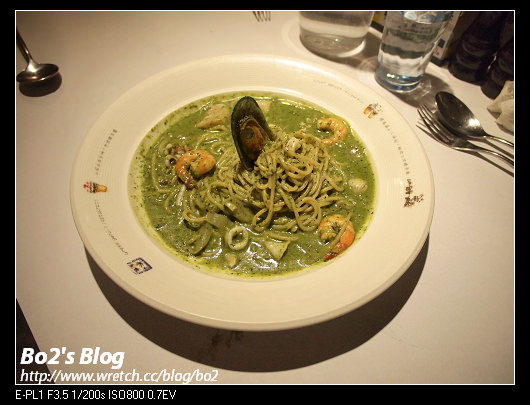 這義大利麵顏色還真是鮮豔,海鮮料看起來很豐富呢麵條軟硬適中,加上有著鮮奶油味而沒有草味的青醬,十分順口。