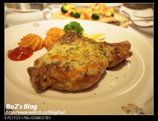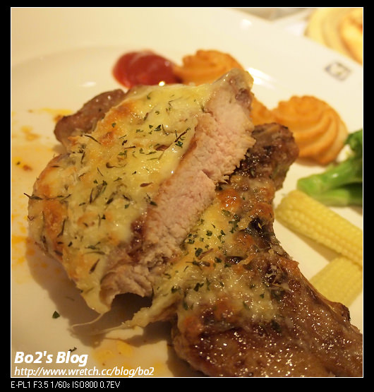 帶骨的豬排上頭那層烤的融化的起司很令人食指大動,上頭灑了香料,香氣十足,感覺應該是迷迭香?豬排厚度很夠,口感紮實中帶點軟嫩,