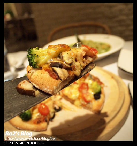 因為怕吃不夠?所以又多點了這道”燻雞野菇披薩”披薩上頭滿滿都是配料,有香菇/燻雞/花椰菜/蕃茄等等,