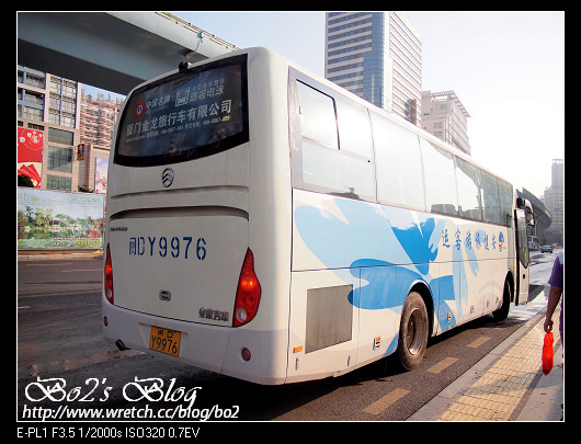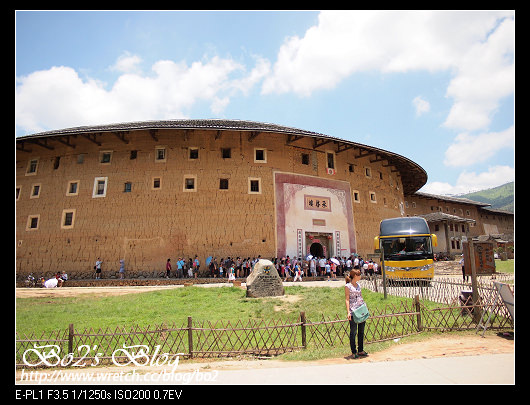 廈門遊相關相片集: [iphone版] [epl1版]—————–話說,會規畫這次的廈門之旅,就是衝著這土樓來的,雖然因為有管制,看到的時間並不算太長,但還是覺得值回票價了,原以為土樓只有貴州那一帶才有,沒想到福建也有,而且還不少群,有所謂的田螺坑土樓群,河坑土樓群等等族繁不及備載。官網上的地圖,好像土樓群間隔都很近,別忘了中國幅員廣大,地圖上的一小步,可能得走個三天三夜都道不了哩。當初在跟旅行社買機+酒行程的時候,是直接+NT.900買單日土樓套裝行程,後來在碼頭有當地人推銷,RMB.120(約NT.600)似乎比較便宜,不過在台灣預先買好,我覺得是買心安,也算是個保障。而這次要看的土樓王承啟樓,就位於永定縣的高北土樓群,出發的前一天,就先跟所謂的車掌小姐連絡,我們住的是廈門動車站前的東南亞大酒店,約七點半,這台白色大巴就會抵達,除了我們,也會有其他酒店的客人參加這一日遊行程,所以還到達其他酒店接送。