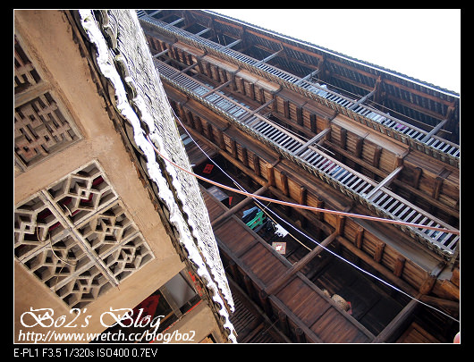 世澤樓的右側,有個看起來上頭傾斜一邊的,叫做五雲樓,建於明朝,已逾500年的歷史了。令人訝異的是,這棟樓竟沒有石砌牆基,還能屹立不搖這麼多年,難怪又被稱為不倒樓,現在也被列為世界遺產中。