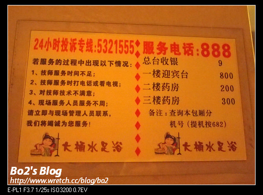 —————–地點:廈門-大桶水足浴位置:福建省厦門市思明區嘉禾路162號電話:0592-5326111日期:2011/7/23官方網站:http://www.datongshui.net/價位:足浴 大桶90分鐘 RMB.90(約NT.420)
