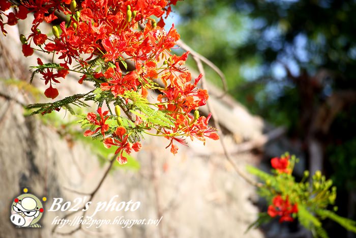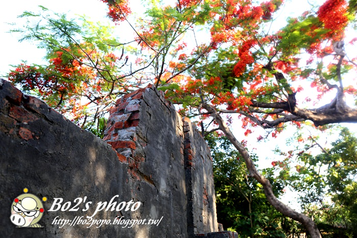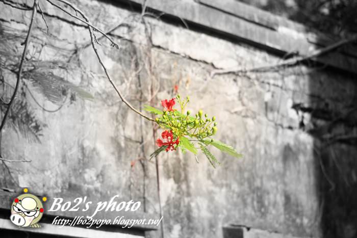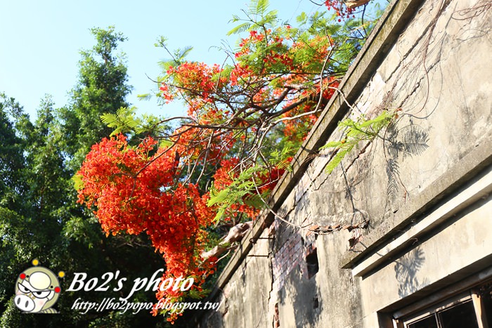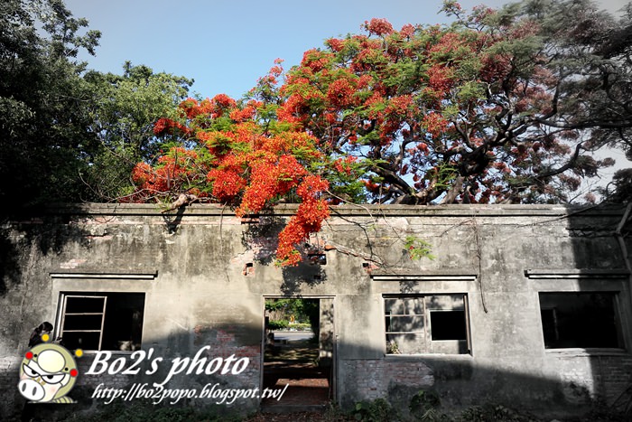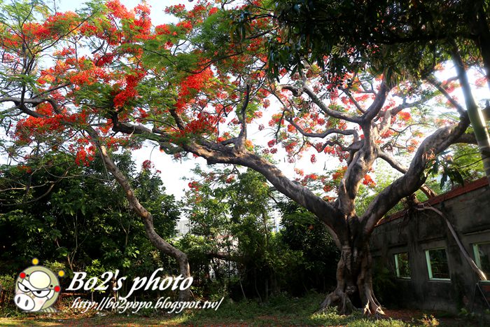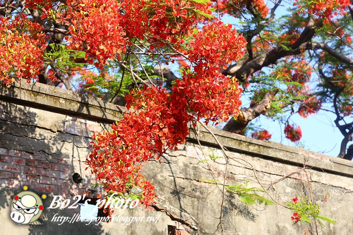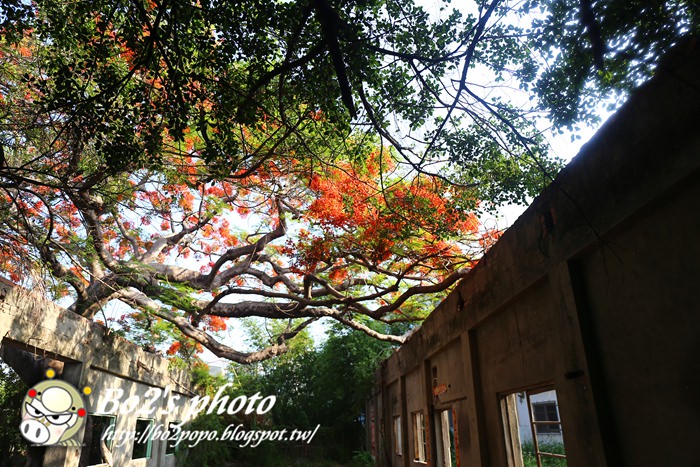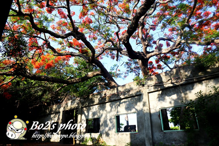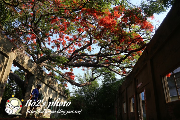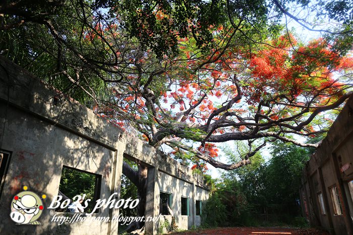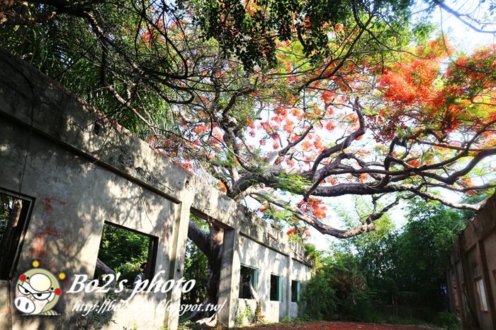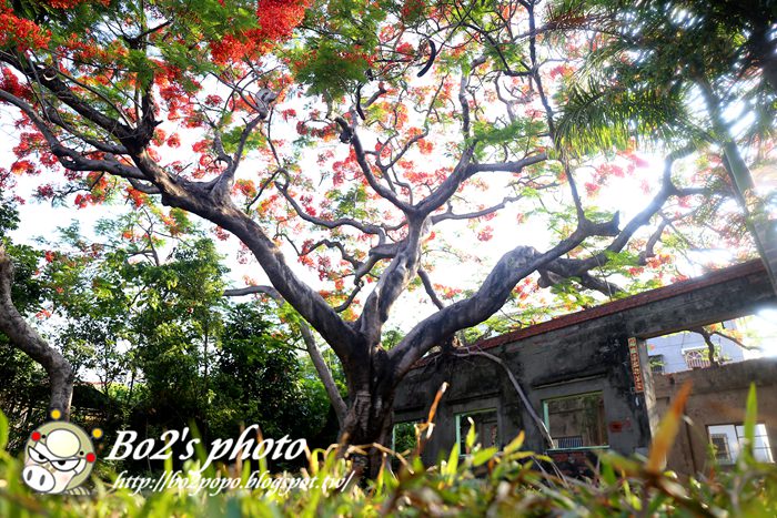 殘破的廢虛內,矗立了一顆大滿開的鳳凰花樹,是個很奇特的景像。