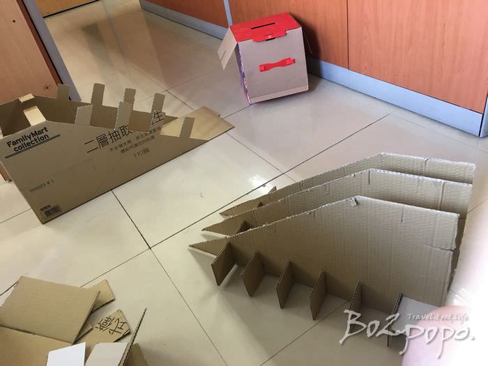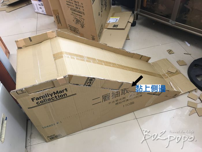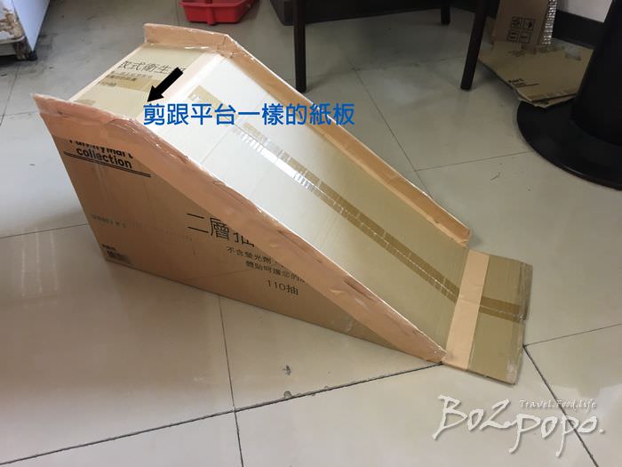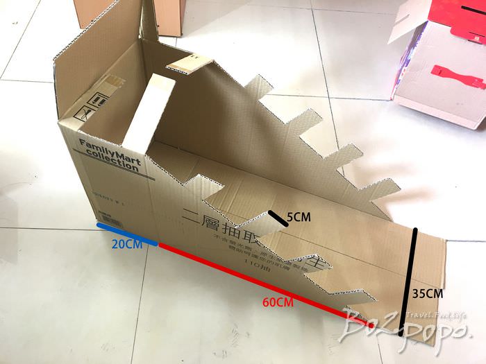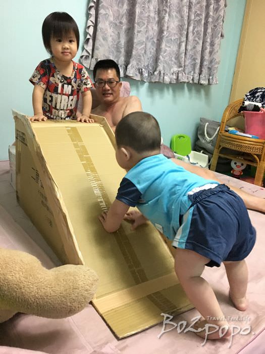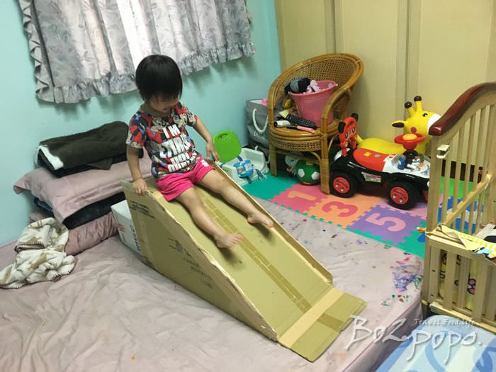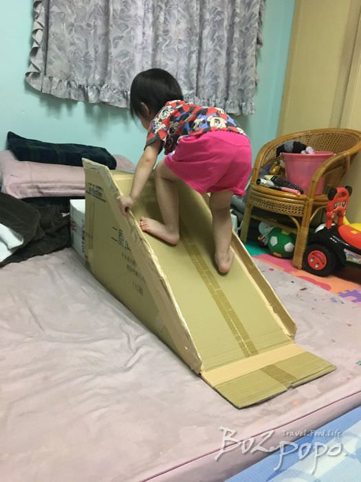 這種狹長型的紙箱拿來做溜滑梯真的會省很多工。