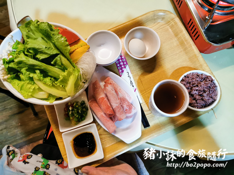 除了主鍋外,還有肉盤/紫米飯/紅茶/蔬菜盤/蛋,