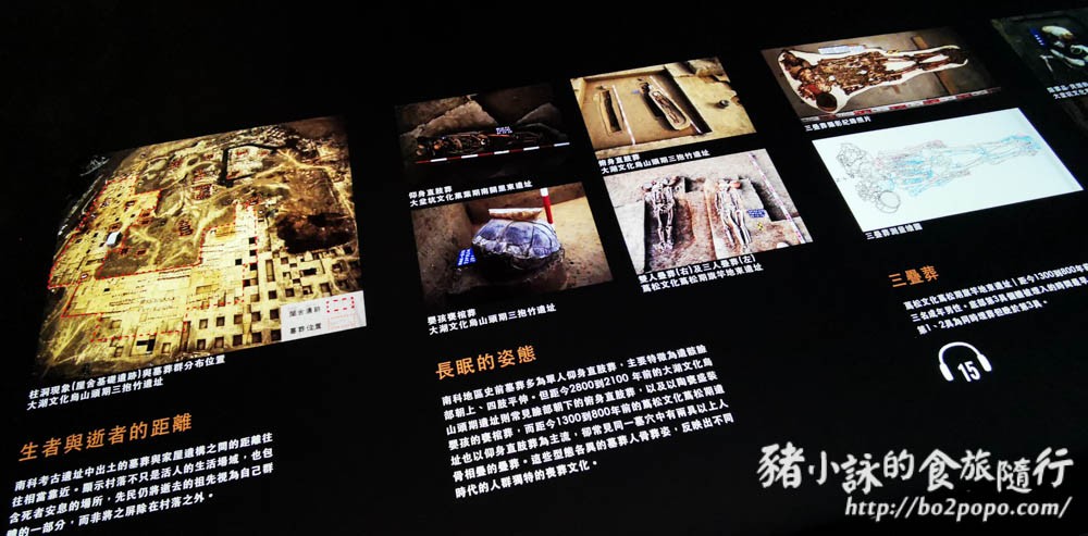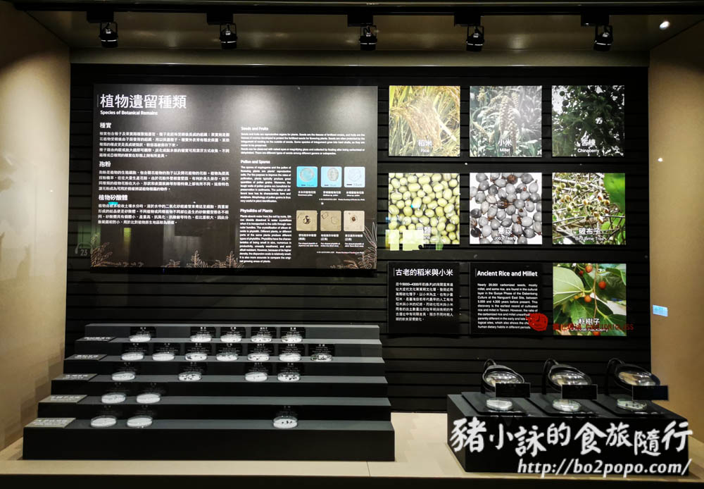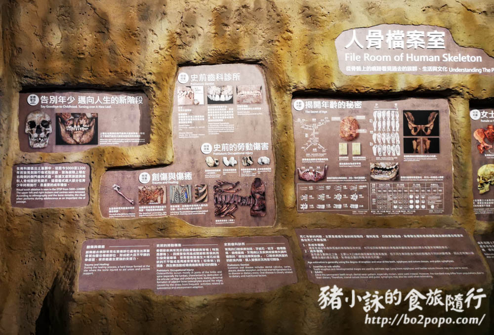 介紹從考古發掘現場取回的界牆/標本/動物骨骼/植物種子/人骨面貌等,