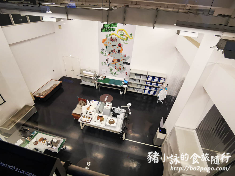 透過玻璃窗可以往下望,展示實驗室的人員研究挖掘出的古物及整理的模樣。