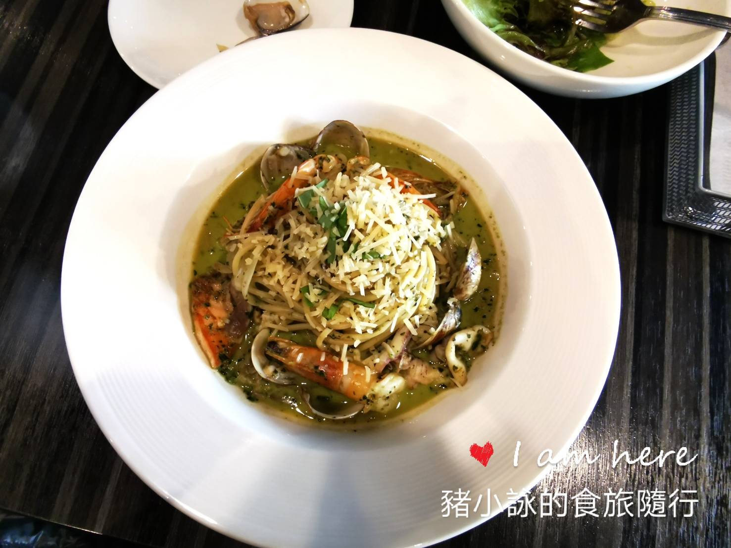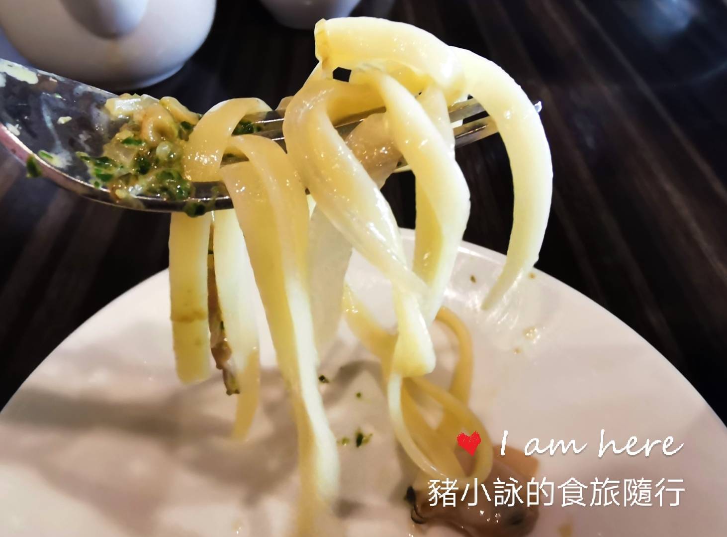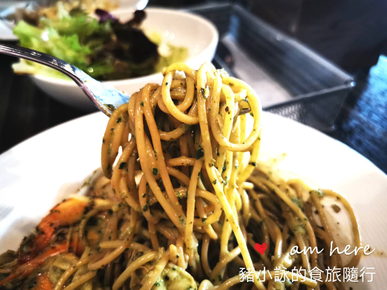調味比較淡,跟青醬義大利麵相比口味是比較清爽的,麵體是扁平寬麵,也蠻有彈性。