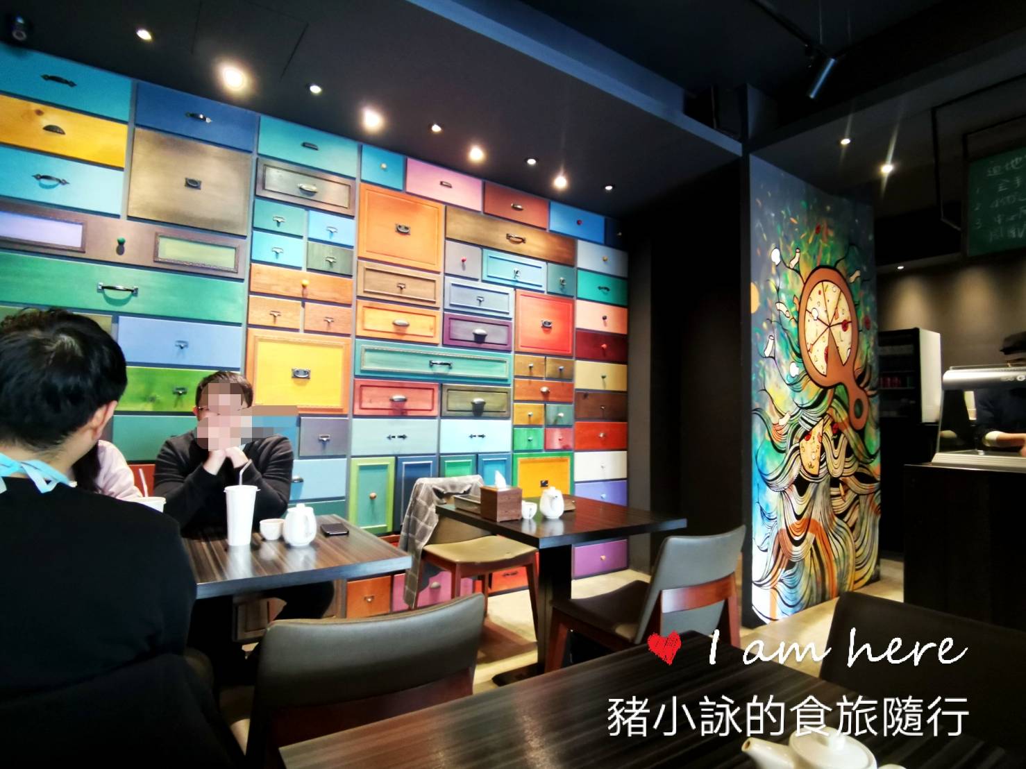 店內牆面是深灰磚牆為主,搭配顏色繽紛的彩色抽屜牆面帶點活潑的感覺,