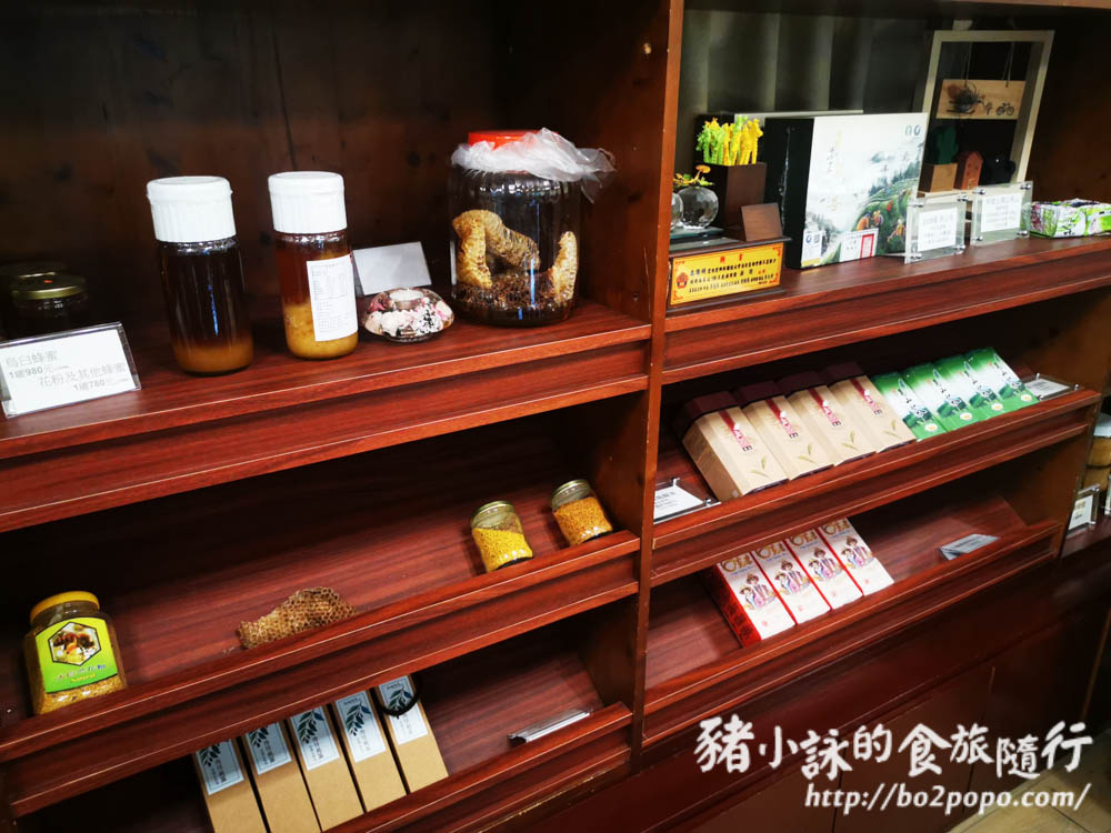 吃完早餐碗盤需自己分類,順便可以看看架上展售的在地產品。