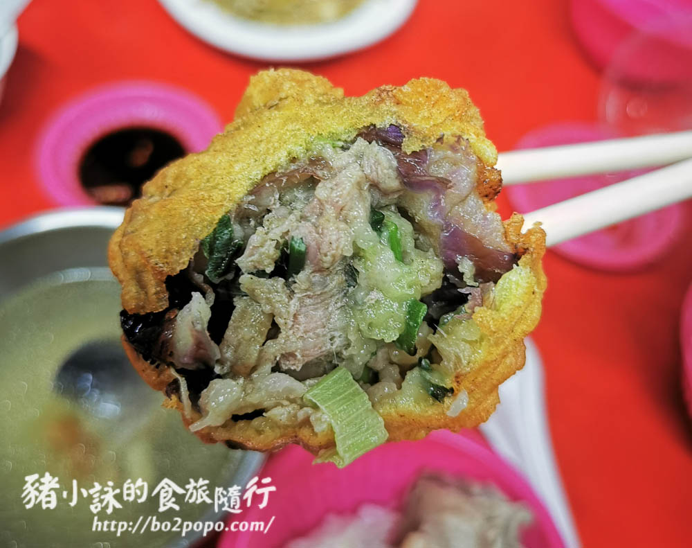 用茄子包住加了滿滿蔥的絞肉下去炸,外酥內嫩,