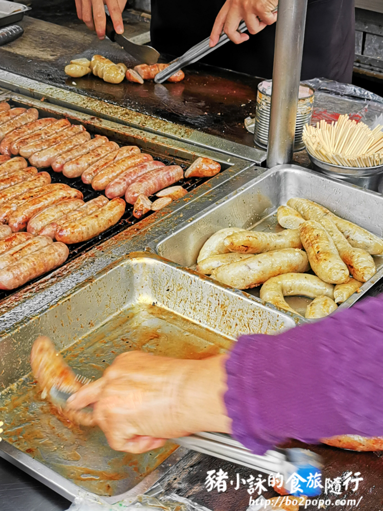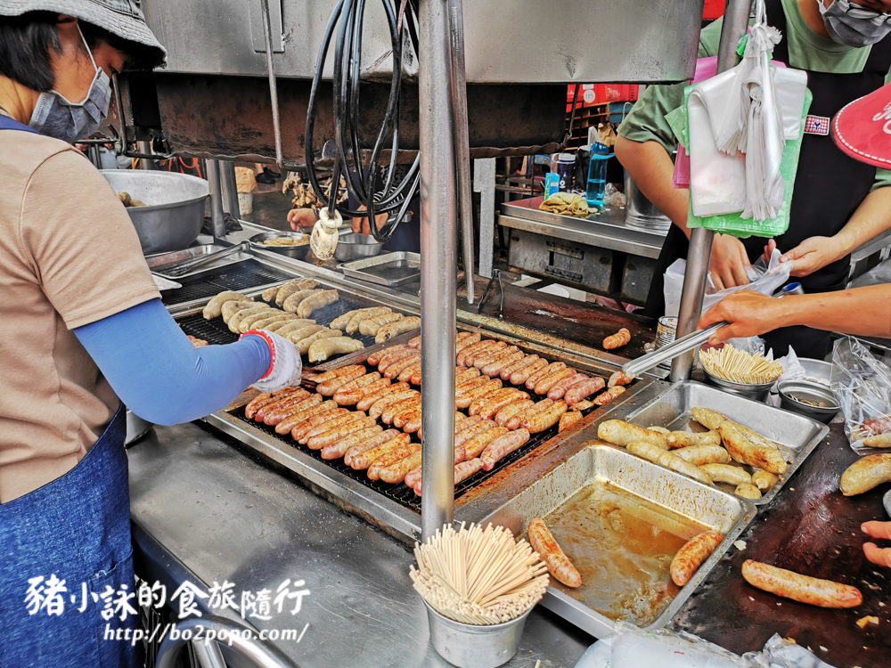 烤網上滿滿的烤大腸跟香腸,店員分工合作各司其職,